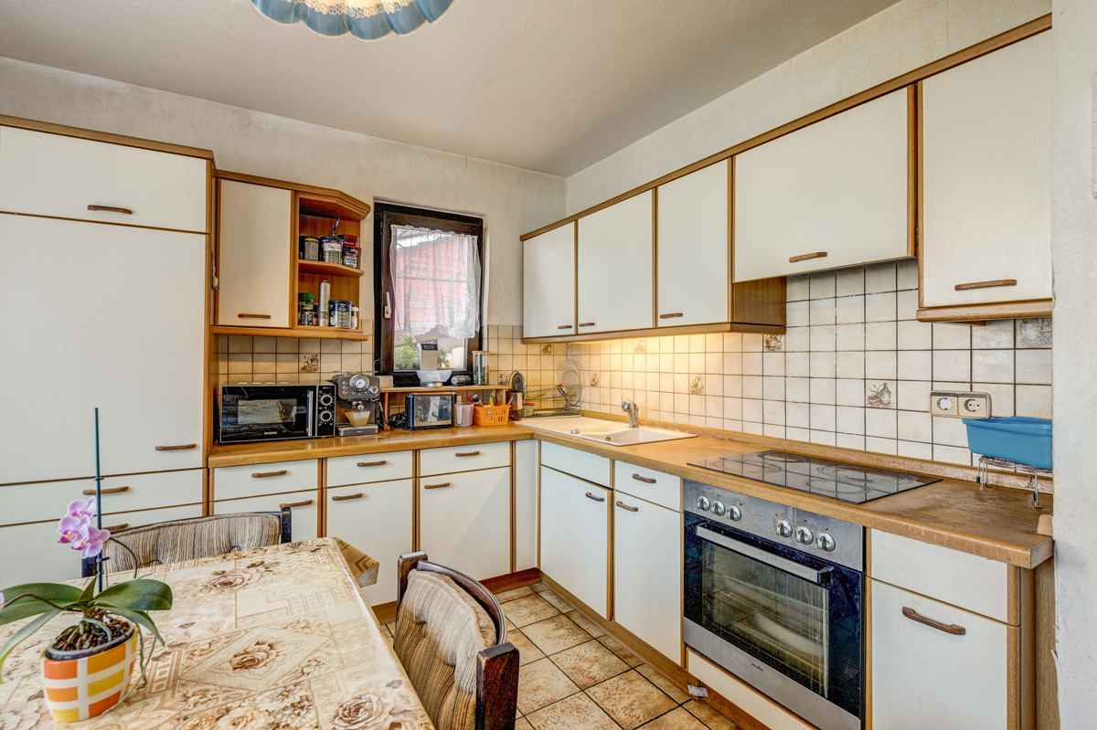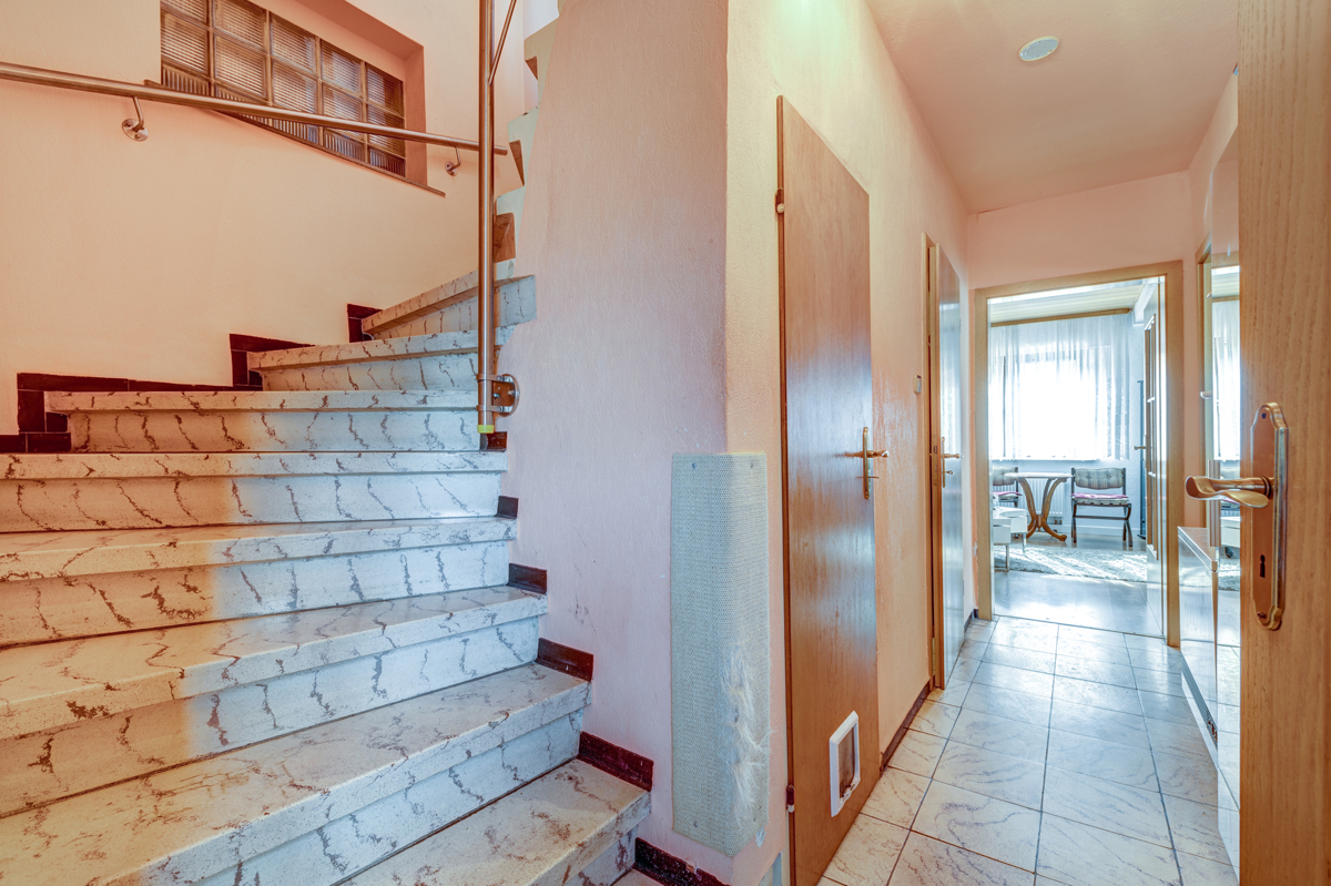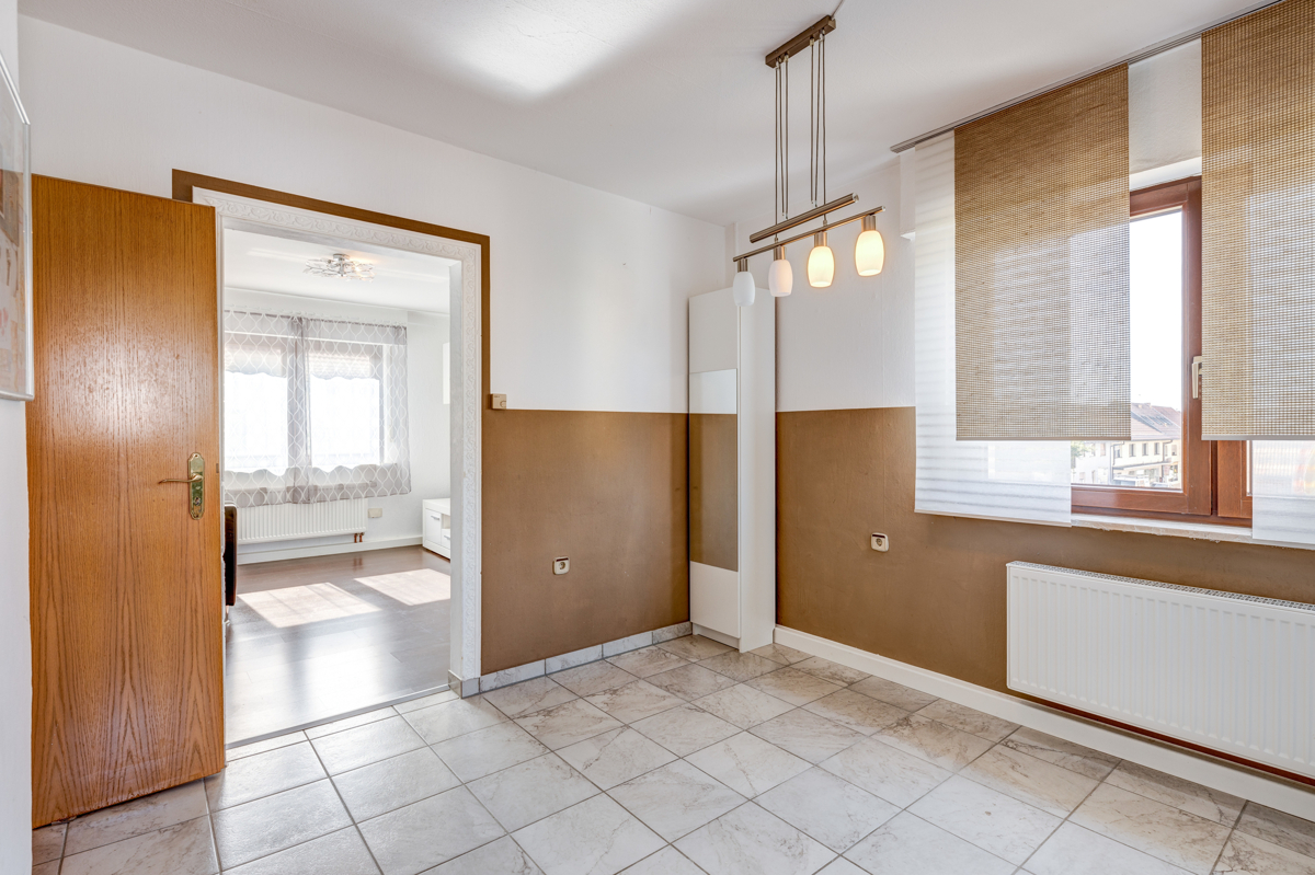 Hier gelangen Sie im 1. Obergeschoß in weitere zwei Schlafzimmer, Küche, Bad und durch einen Anbau in ein Gäste WC.