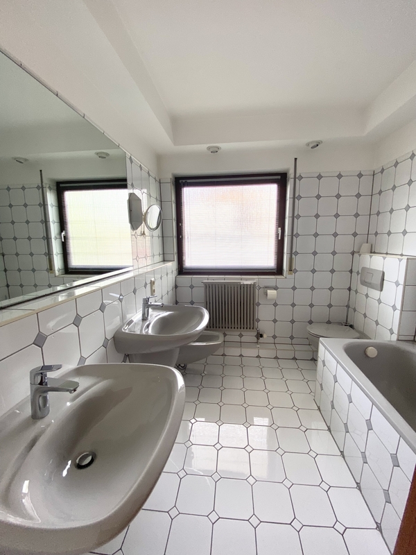 Das Hauptbad (Tageslicht-Bad) hat eine Duschwanne, 2 Waschbecken, sowie ein Bidet.