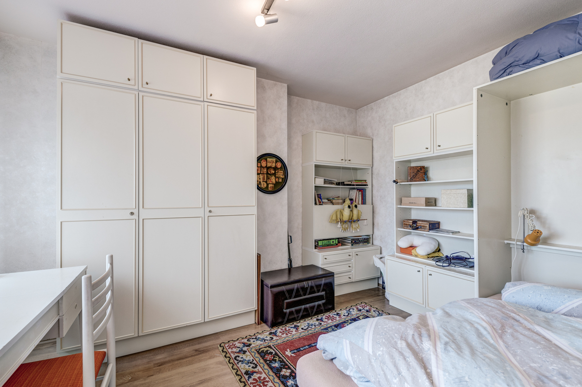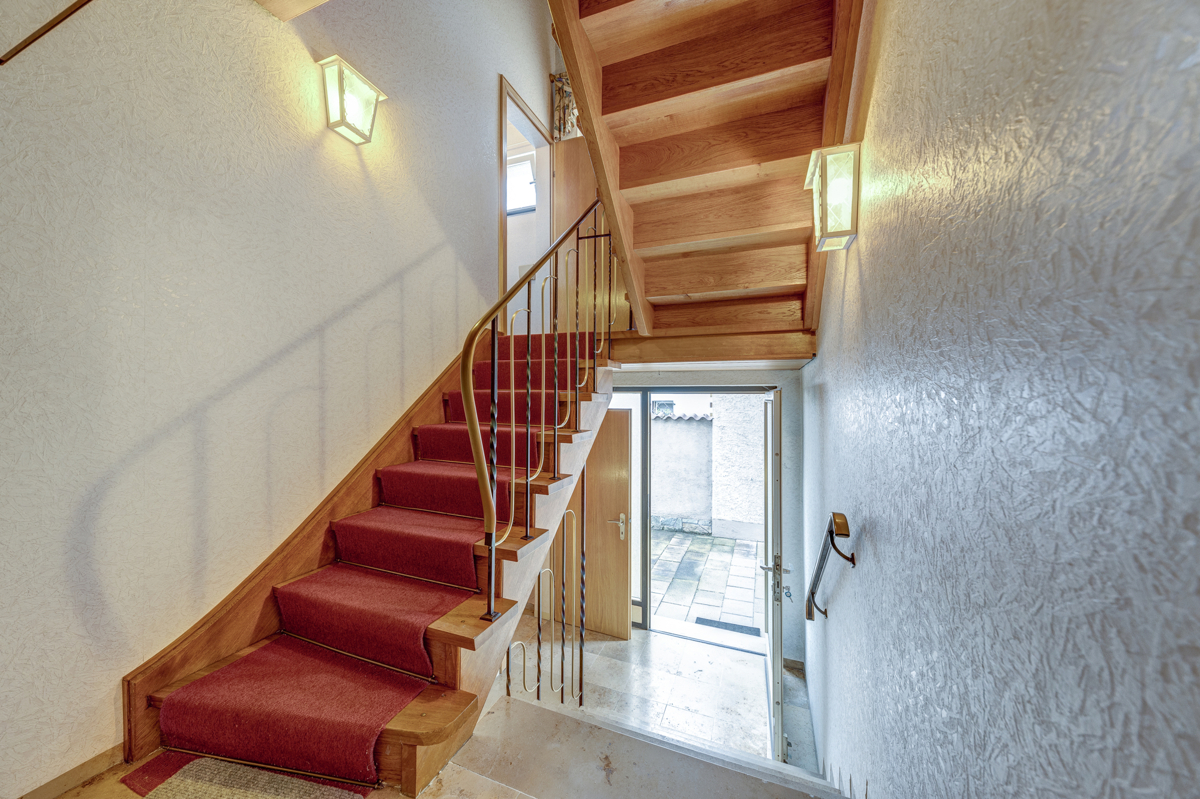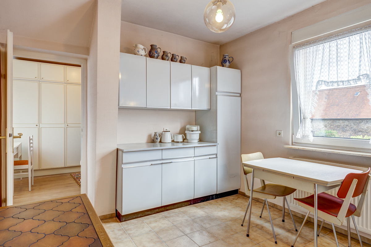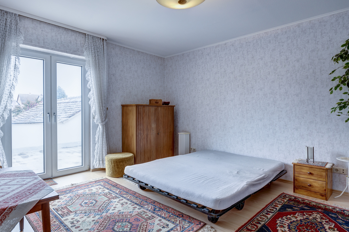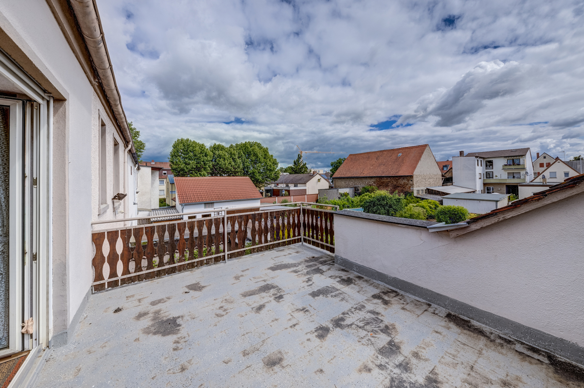 Das Obergeschoss hat 3 ½ Zimmer, eine Küche, ein Bad und einen großen Balkon.