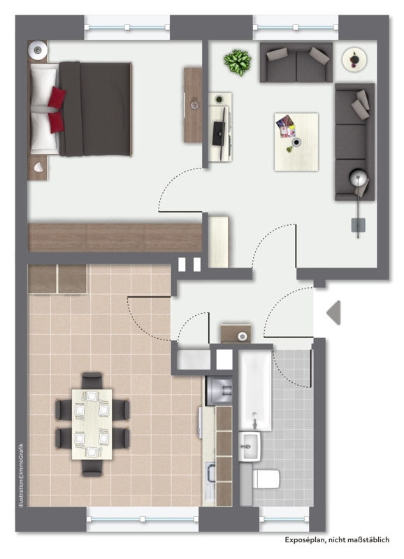 Die 2-Zimmer-Wohnung verfügt über eine Wohnküche, ein Wohn- und ein Schlafzimmer. Zudem stehen Ihnen ein Tageslichtbad mit Wanne und ein Abstellraum innerhalb der Wohnung zur Verfügung.