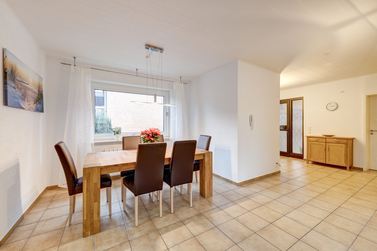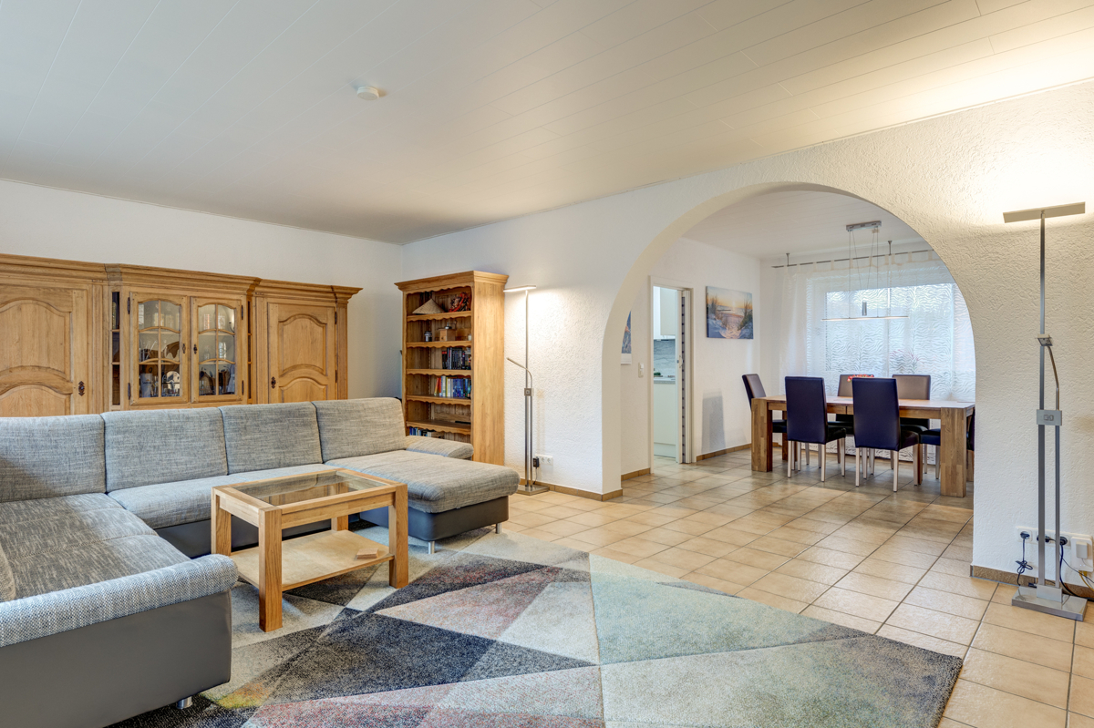 Der geräumige Bungalow bietet im Erdgeschoss eine große Küche mit separater Essecke, welche direkt an das Herzstück des Hauses angrenzt: das Wohnzimmer. Im Erdgeschoss befinden sich ausserdem ein Schlafzimmer, ein Gäste-/Arbeitszimmer, ein Tageslichtbad mit Badewanne und separater Dusche und ein Gäste-WC.