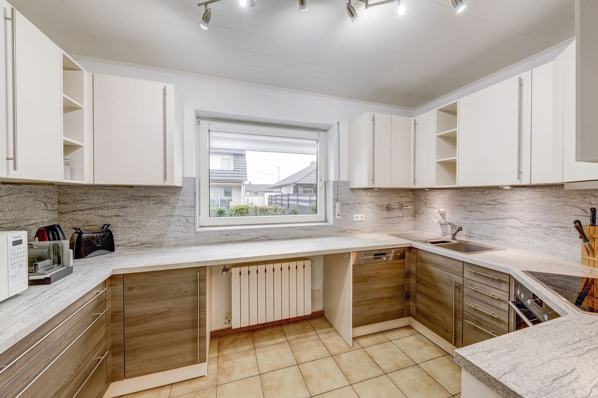 Eine nach Südwesten ausgerichtete Terrasse, ein gepflegter Garten und eine große Garage mit davor liegendem Stellplatz runden das Angebot ab!