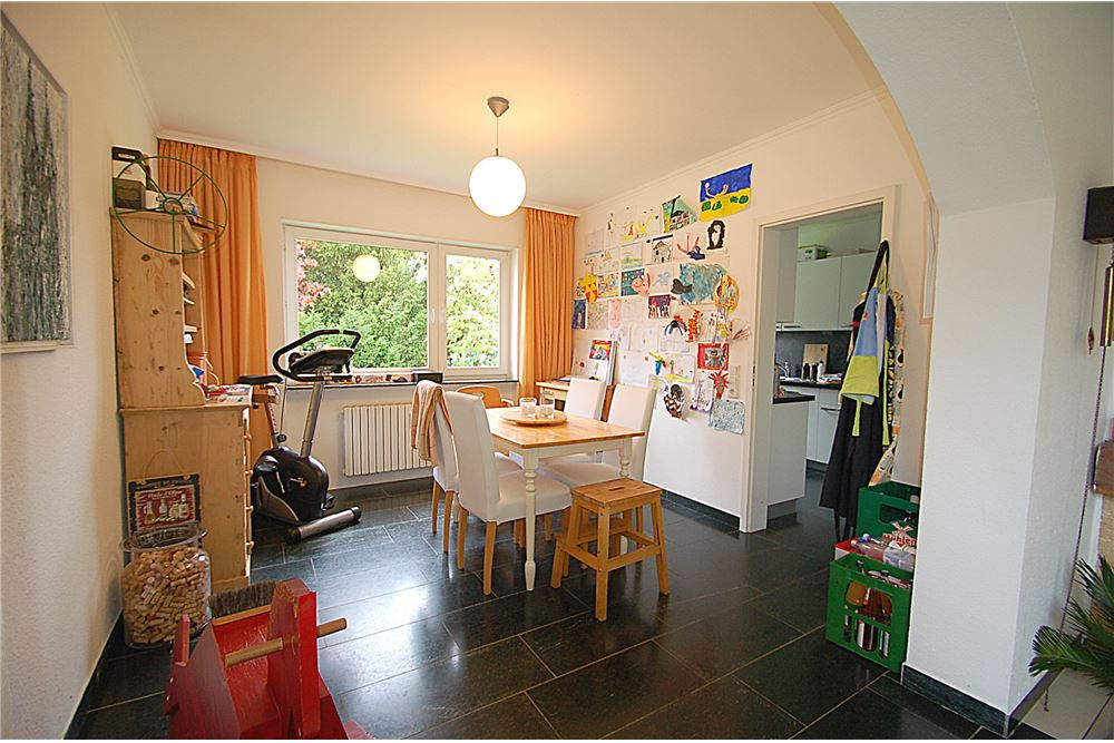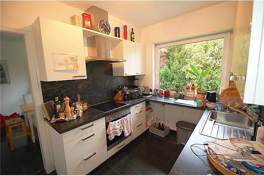 Bei dieser Immobilie können Sie sich wie in einem Einfamilienhaus fühlen, mit eigenem Eingang, eigener Keller und eigenen großen Garten! Durch eine geschickte Aufteilung der Immobilie mit insgesamt 4 Parteien, bewegen Sie sich vollkommen unabhängig in einem komplett eigenen Bereich!Durch die Diele, mit ihrem hochwertigem Schieferboden, gelangen Sie in das schöne, helle Wohnzimmer mit großer Fensterfront zum Garten. Der Kamin bietet Ihnen, gerade in den kälteren Monaten, eine angenehme Wohnatmosphäre. Das Esszimmer ist separat und direkt neben der modernen Küche gelegen.