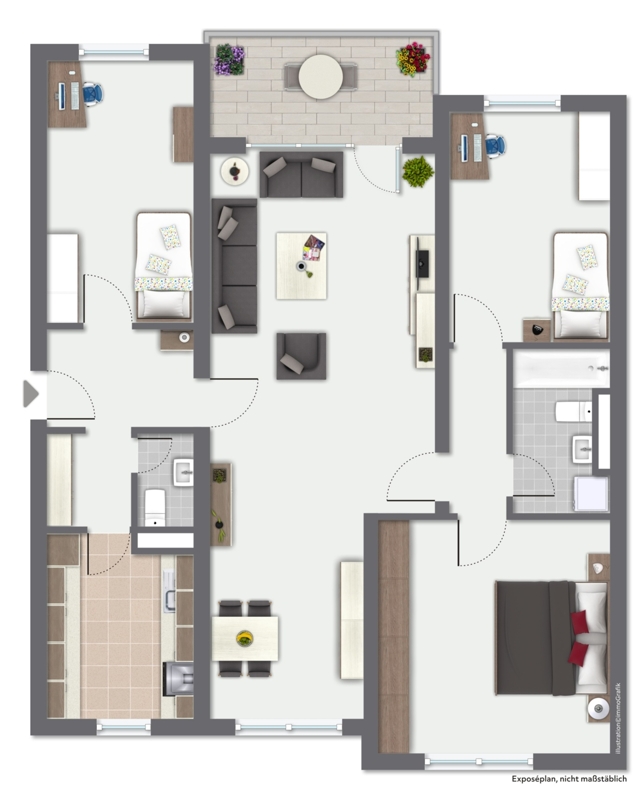 Die Wohnung verfügt über insgesamt vier Zimmer. Neben dem Wohn- und Essbereich gibt es drei weitere Zimmer, die als Schlafzimmer, Arbeitszimmer oder Kinderzimmer gestaltet werden können.