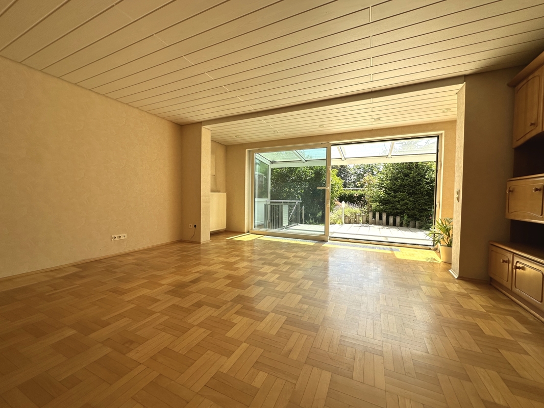 Vom Wohn- und Essbereich gelangen Sie auf die überdachte Terrasse mit Sonnenschutz und in den Garten.
