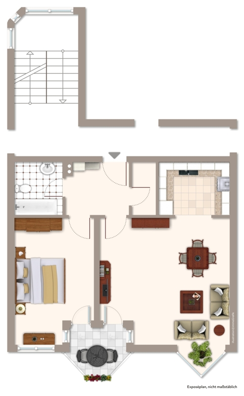 - Wohnfläche: ca. 70 m²- Zimmer: 2 (großzügiger Wohnbereich mit offener Küche, Schlafzimmer)