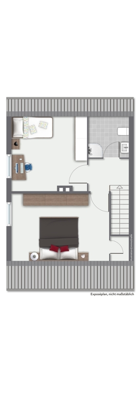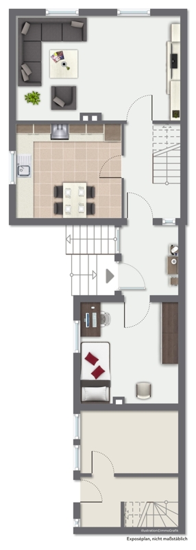 - Erdgeschoss mit einem Wohnzimmer, einem Schlafzimmer, einem Flur und einer Küche- 1.Obergeschoss mit 2 Schlafzimmern, einem Flur und einem Tageslichtbad