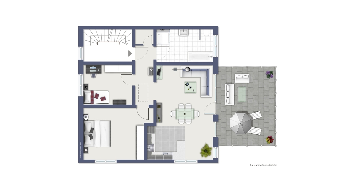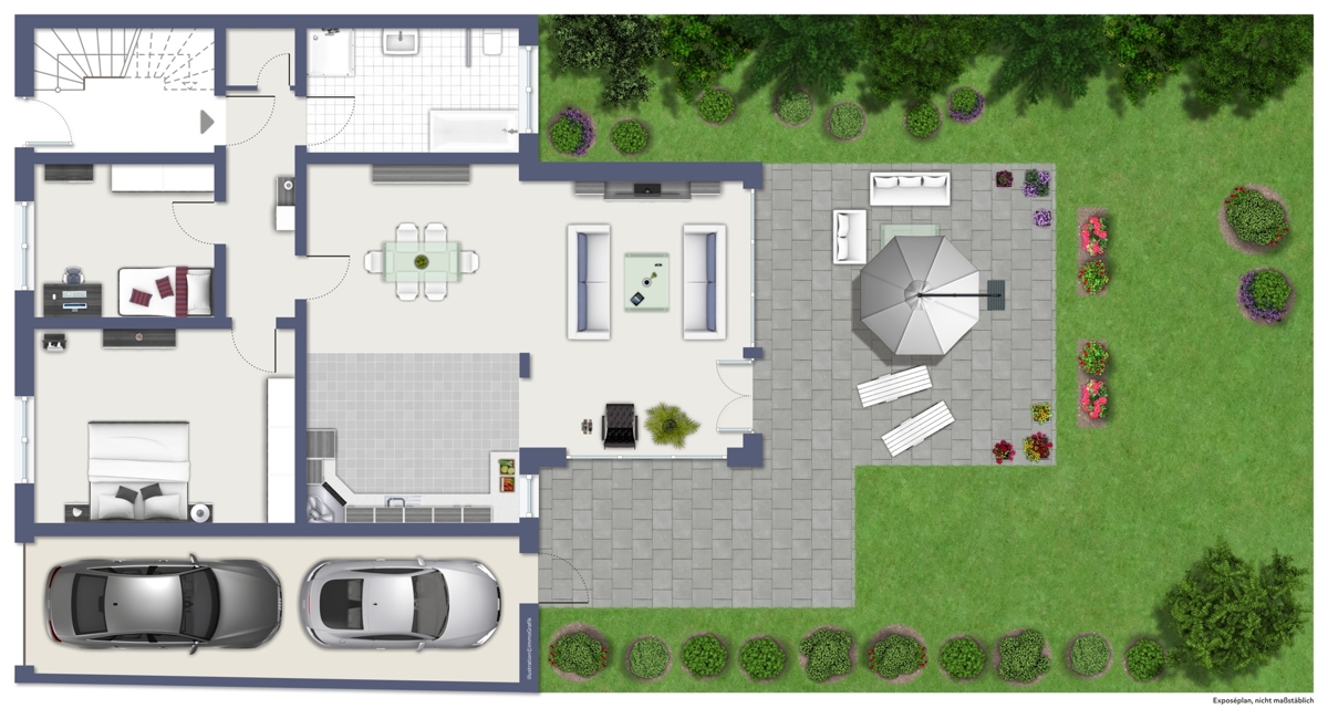 Die Wohnfläche von ca. 203 m² verteilt sich auf zwei großzügige Wohnungen. Im Erdgeschoss befindet sich eine 3,5-Zimmer-Wohnung mit einer offenen Küche im Wohn- und Essbereich. Vom Wohnzimmer gelangen Sie direkt auf eine einladende Terrasse, die an den angrenzenden Garten führt – perfekt für gesellige Abende im Freien. Die angrenzende Garage kann sowohl als Parkplatz oder auch als "Kellerersatz" genutzt werden.