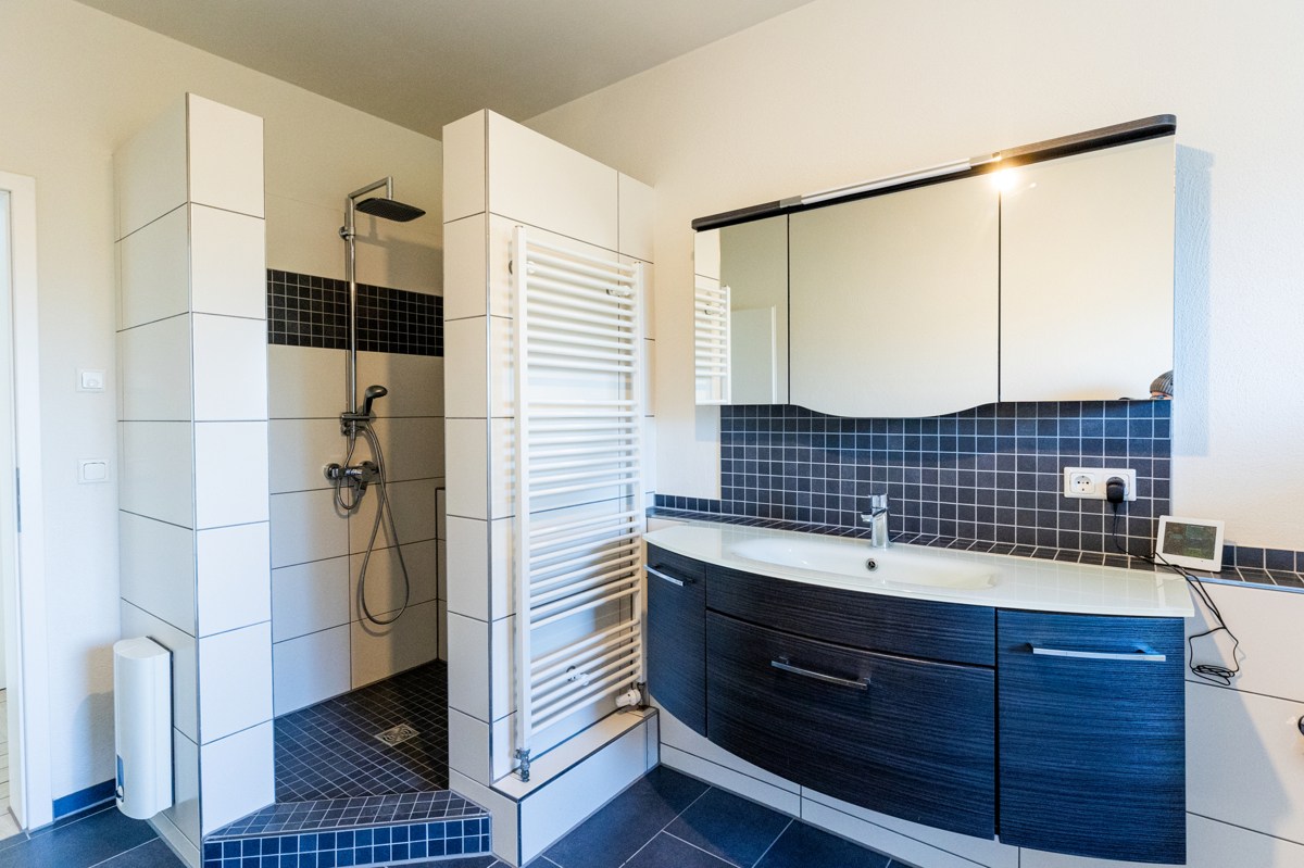Die Wohnung im Obergeschoss umfasst 3 Zimmer, ebenfalls mit einer offenen Küche im Wohn- und Essbereich, sowie einen großen Balkon und Zugang zum einen Speicher. Beide Wohnungen verfügen über ein großes Bad mit Wanne und Dusche, was den hohen Wohnkomfort unterstreicht. Ein zusätzlicher Abstellraum sorgt für Ordnung und Stauraum.