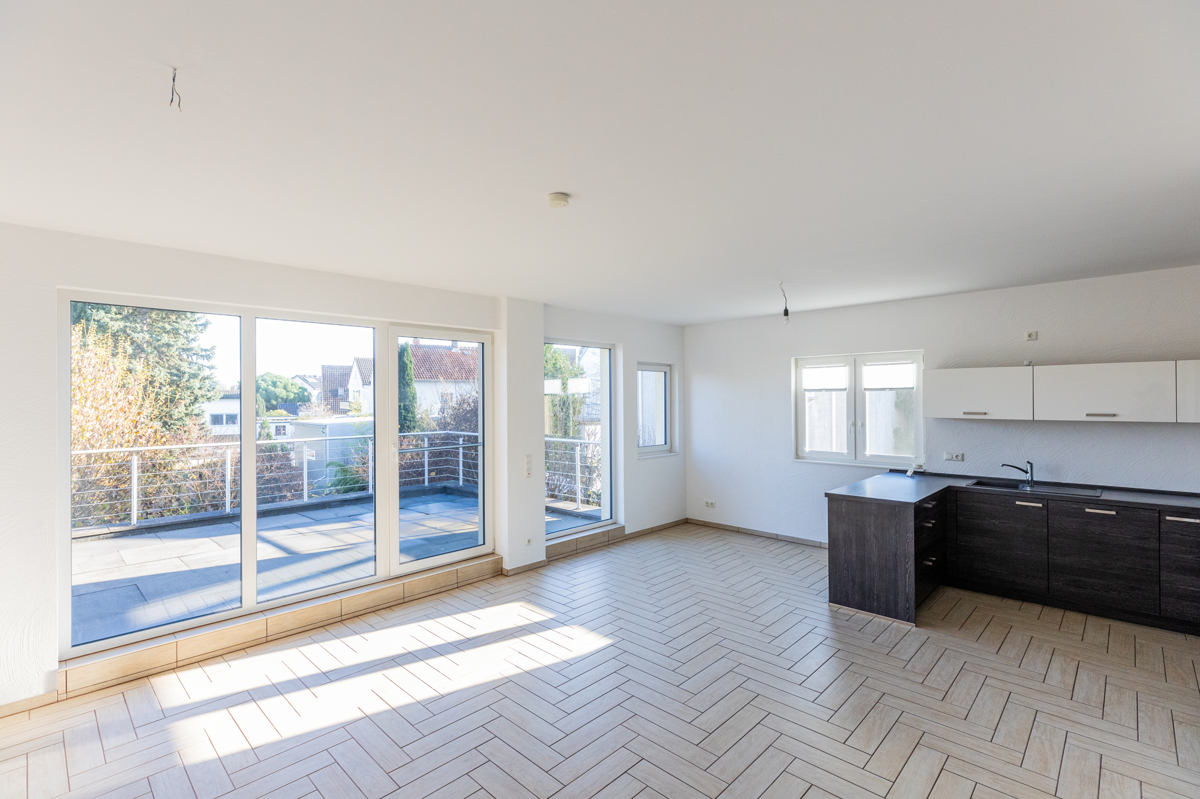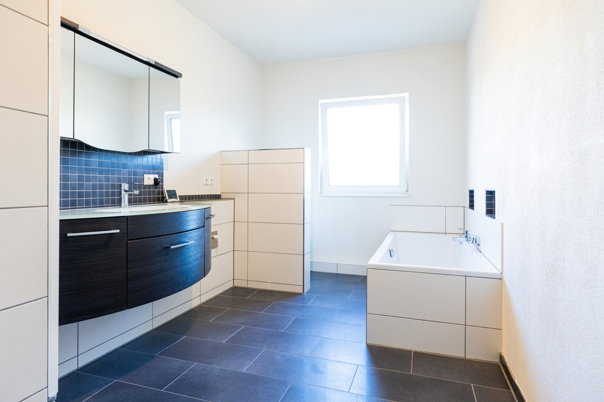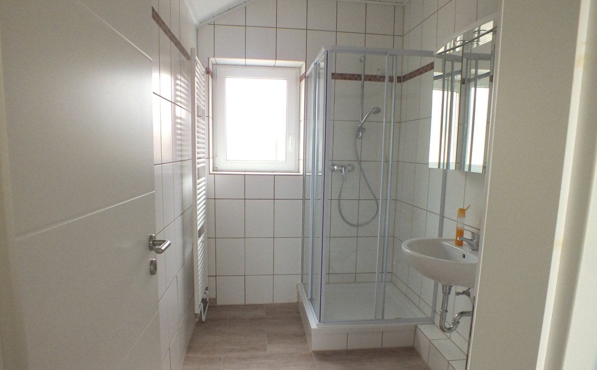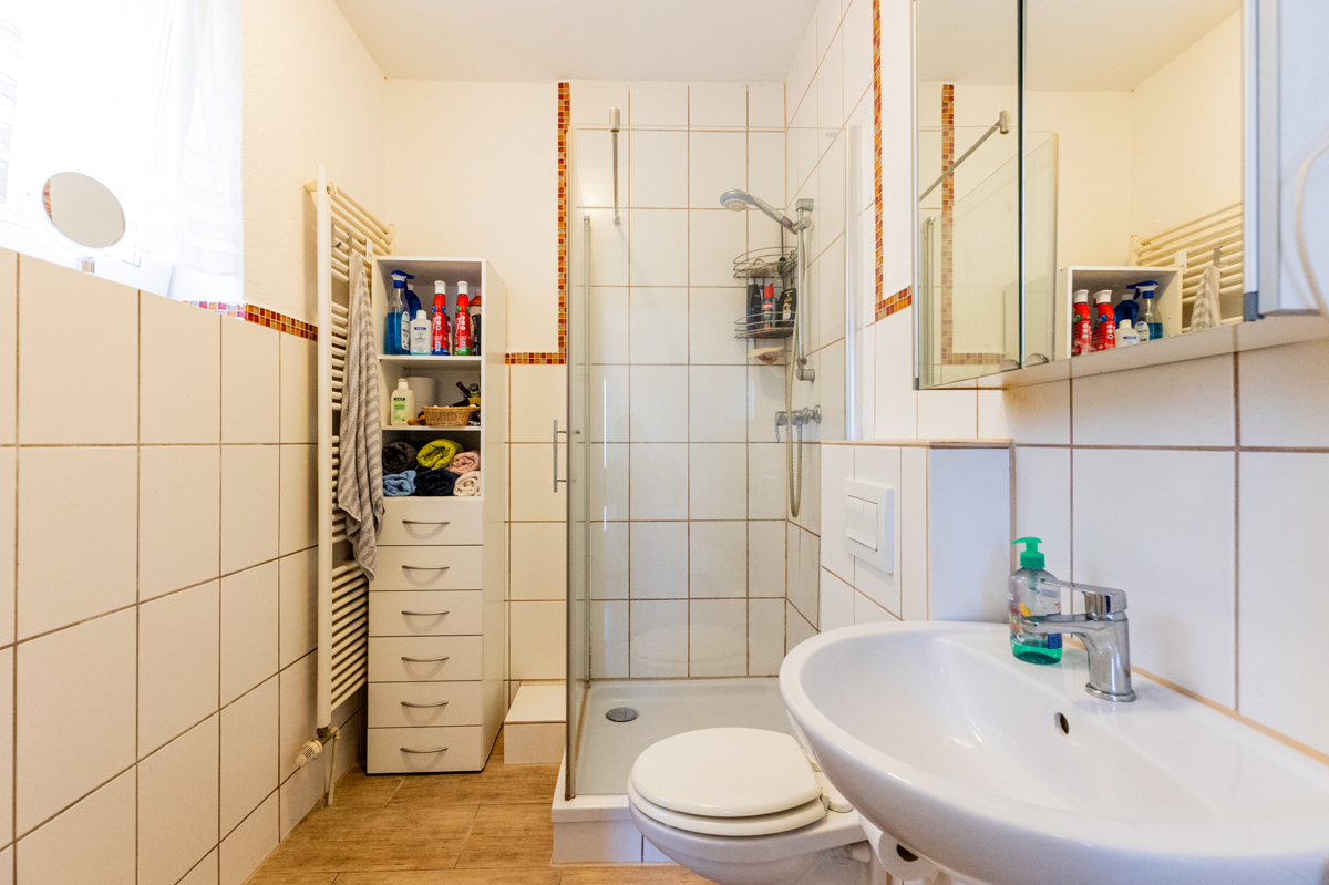 Die Wohnung im Obergeschoss umfasst 3 Zimmer, ebenfalls mit einer offenen Küche im Wohn- und Essbereich, sowie einen großen Balkon und Zugang zum einen Speicher. Beide Wohnungen verfügen über ein großes Bad mit Wanne und Dusche, was den hohen Wohnkomfort unterstreicht. Ein zusätzlicher Abstellraum sorgt für Ordnung und Stauraum.