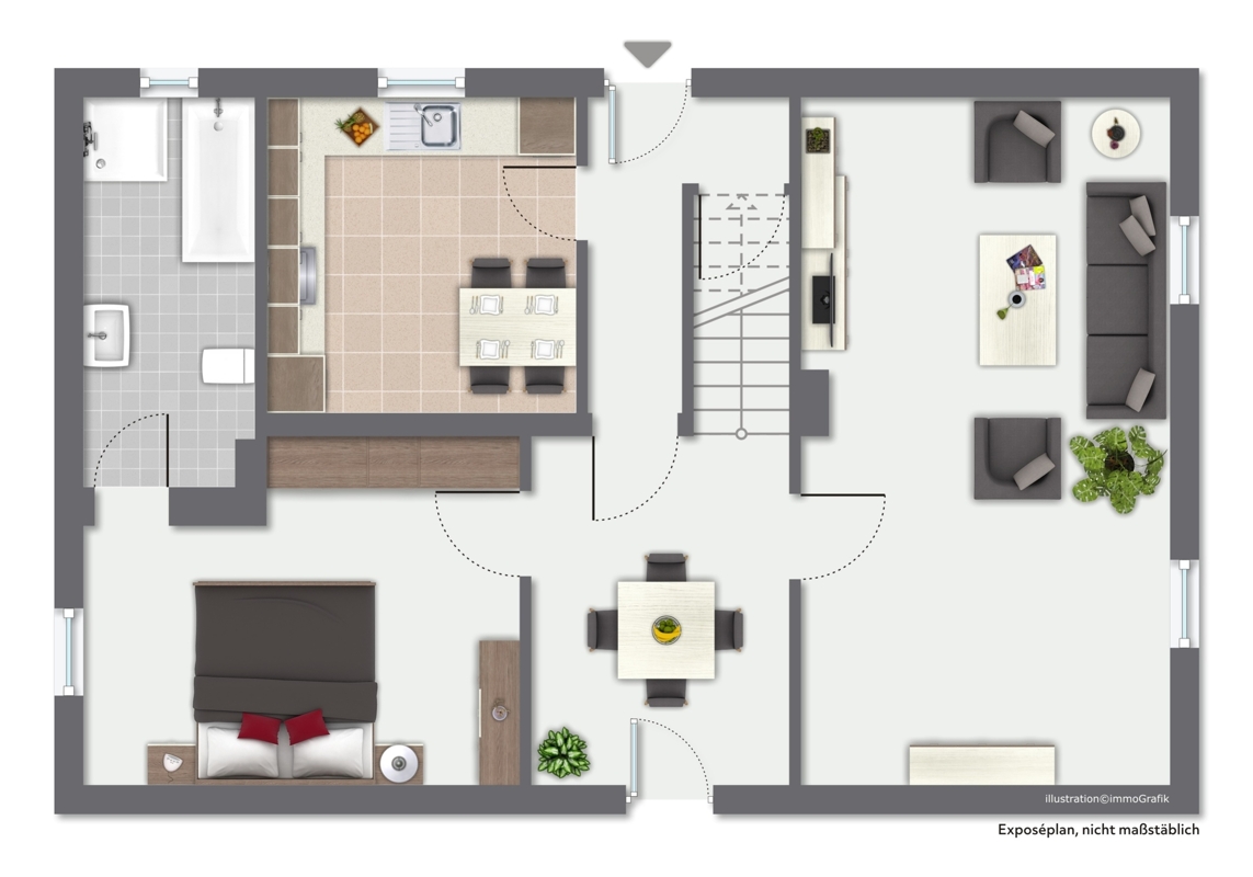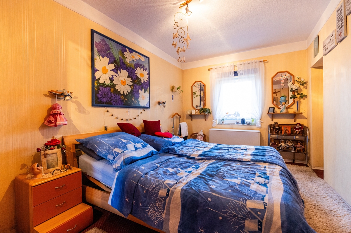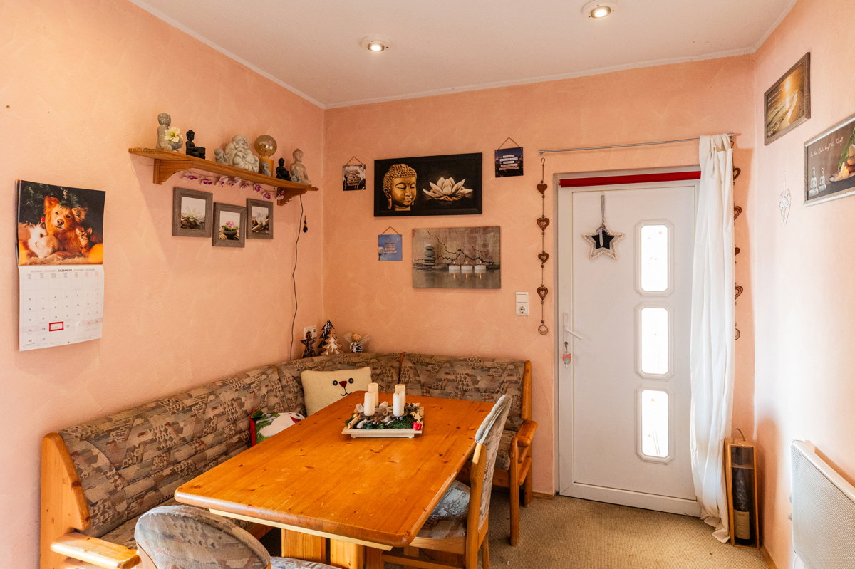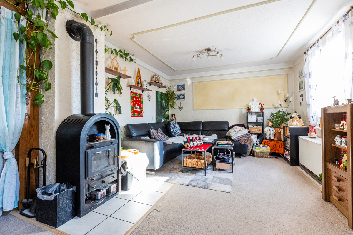 Beim Betreten des Hauses gelangen Sie über den Flur direkt zum Kellerabgang sowie in die Küche. Von hier aus erreichen Sie einen Zwischenraum, der sich ideal als Esszimmer nutzen lässt. Angrenzend befindet sich das großzügige Wohnzimmer mit gemütlichem Kamin, der an kalten Tagen für eine wohlige Atmosphäre sorgt. Ein weiteres Schlafzimmer mit angrenzendem Tageslichtbad rundet das Raumangebot im Erdgeschoss ab.