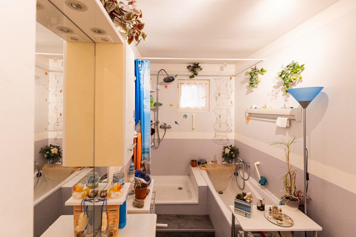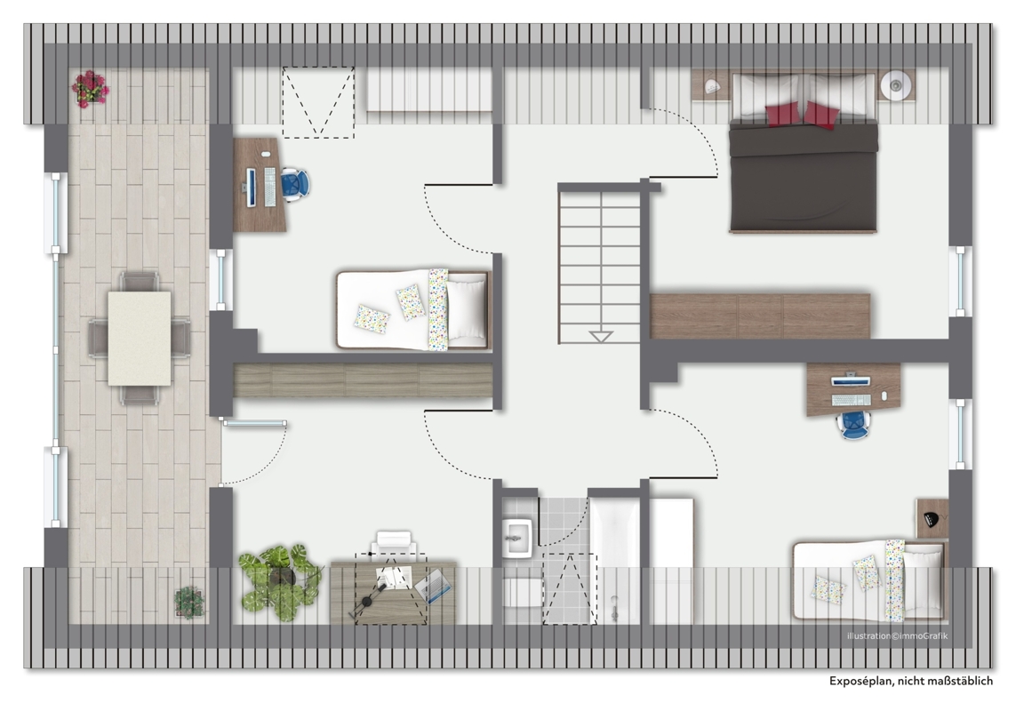Im oberen Stockwerk erwarten Sie drei weitere Zimmer, die sich als Kinderzimmer, Schlafzimmer oder Büro nutzen lassen. Zusätzlich gibt es ein weiteres Tageslichtbad sowie eine Küche mit direktem Zugang zum Balkonwintergarten. Diese Räumlichkeit lässt sich auch zu einem weiteren Schlaf- oder Kinderzimmer umfunktionieren.