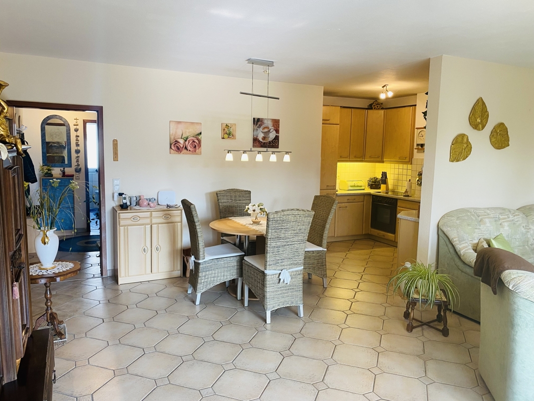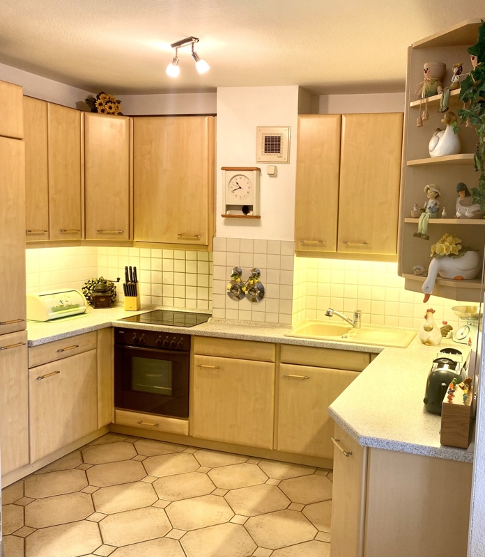 - Küche: offener Küchenbereich mit Einbauküche und Geräten