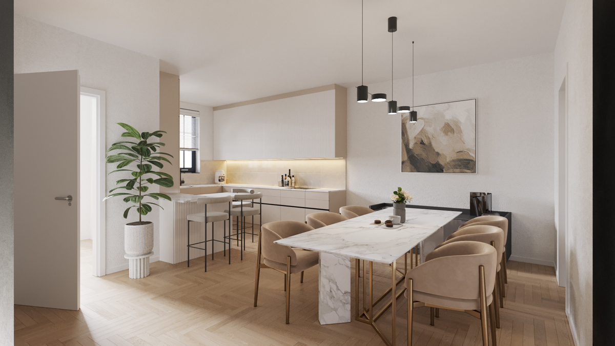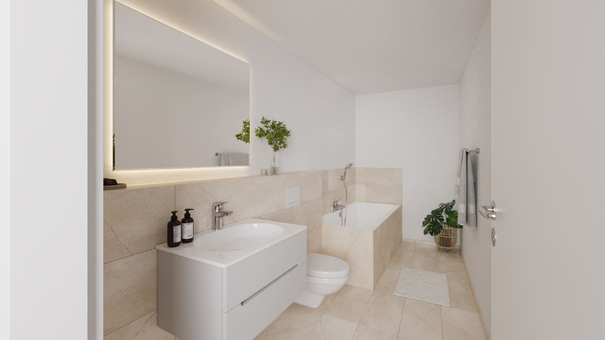 Der offene Wohn- und Essbereich ist das Herzstück jeder Einheit und lädt zu geselligen Zusammenkünften ein. Die Möglichkeit, eine moderne offene Küche zu integrieren, fördert die Kommunikation und schafft einladende Räume für die ganze Familie. Praktische Details wie ein Hauswirtschaftsraum ergänzen die Funktionalität und bieten zusätzlichen Stauraum.