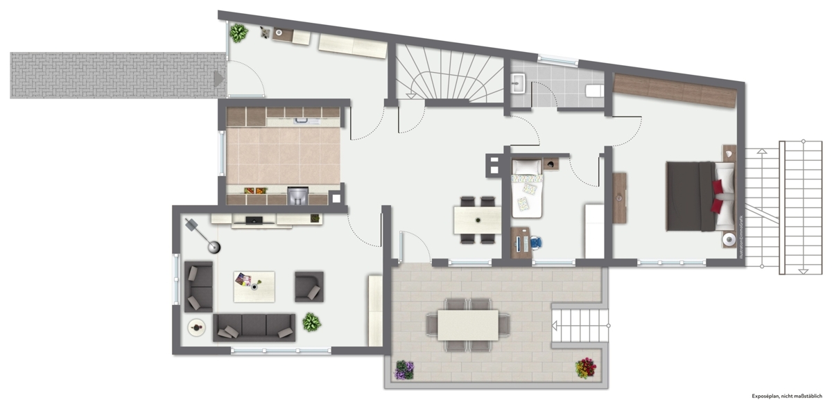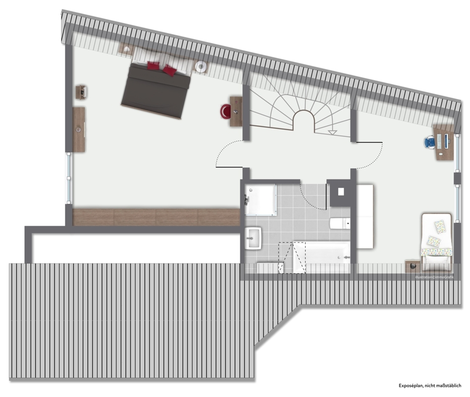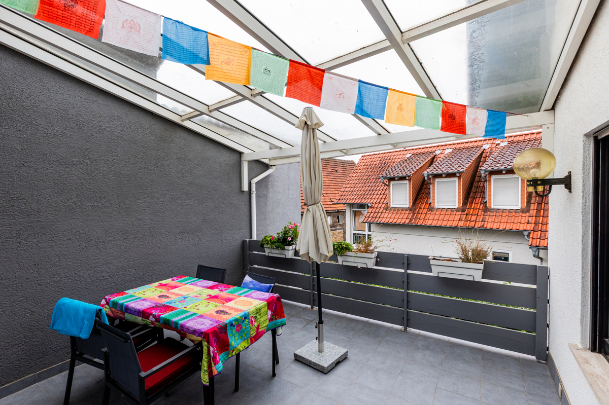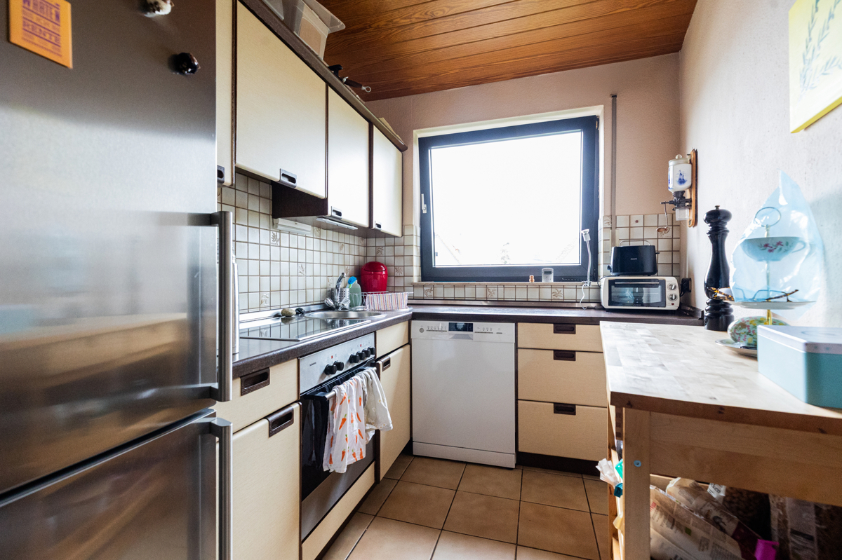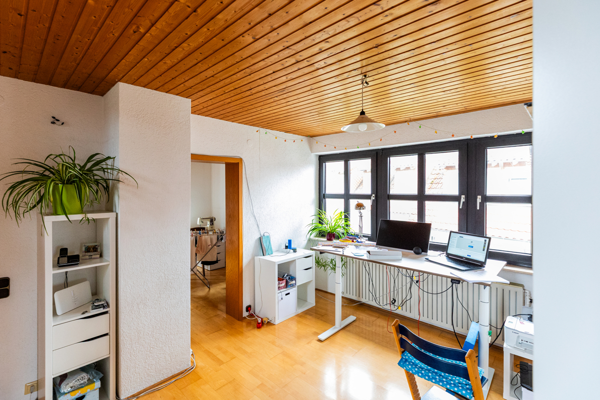 - die zweite Wohnung befindet sich im 1.Obergeschoss und Dachgeschoss mit 4 Zimmern, Küche, Tageslichtbad, Gäste-WC und großer Sonnenterrasse
