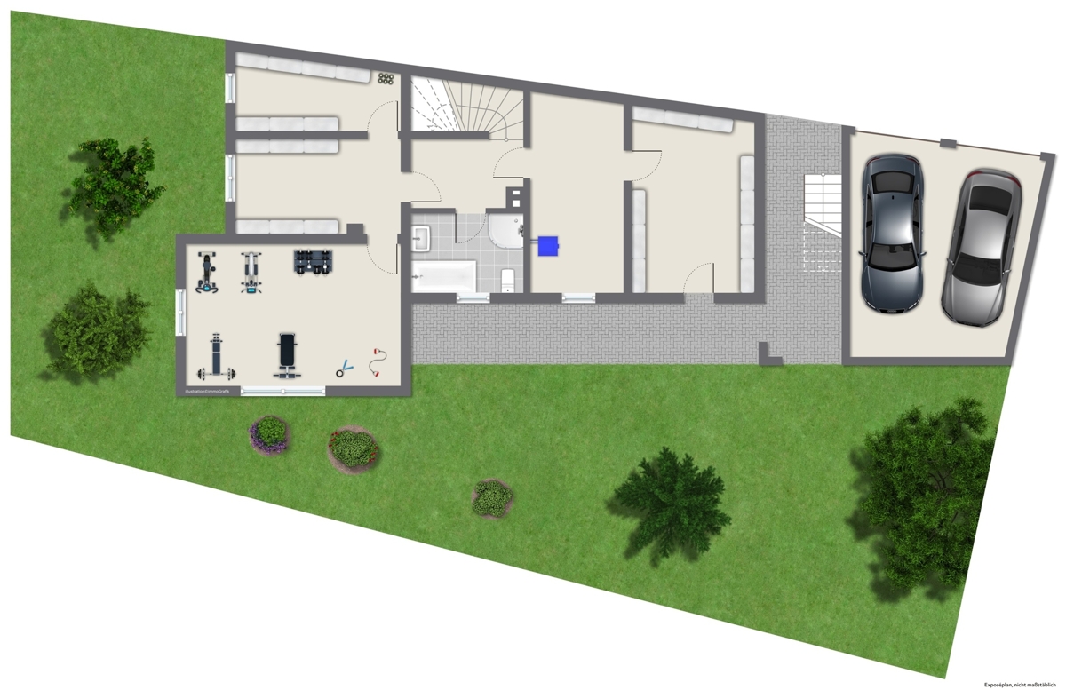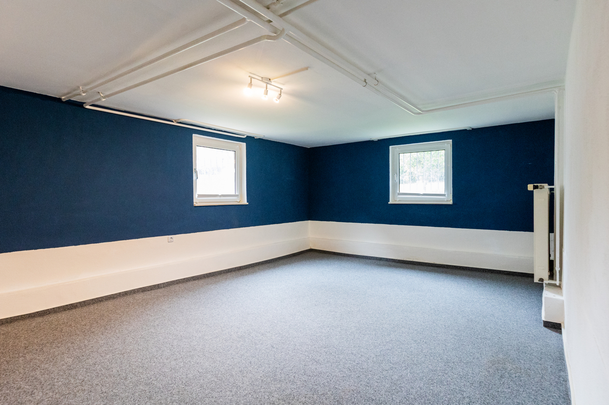 - Erdgeschoss (freigestellt) mit 4 Zimmern, Küche, Tageslichtbad, Gäste-WC, 2 Hobbyräumen und einem Kellerraum- Terrasse und Garten zum Erdgeschoss gehörig