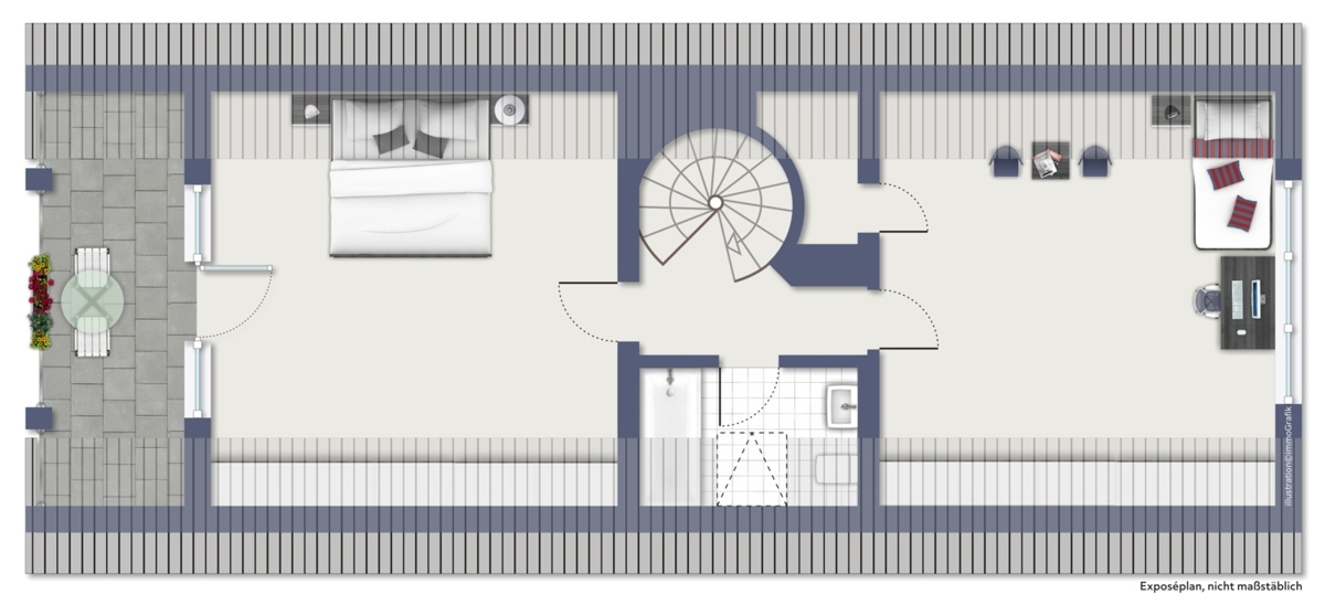 - Über eine elegante Wendeltreppe gelangen Sie in das obere Geschoss der Wohnung