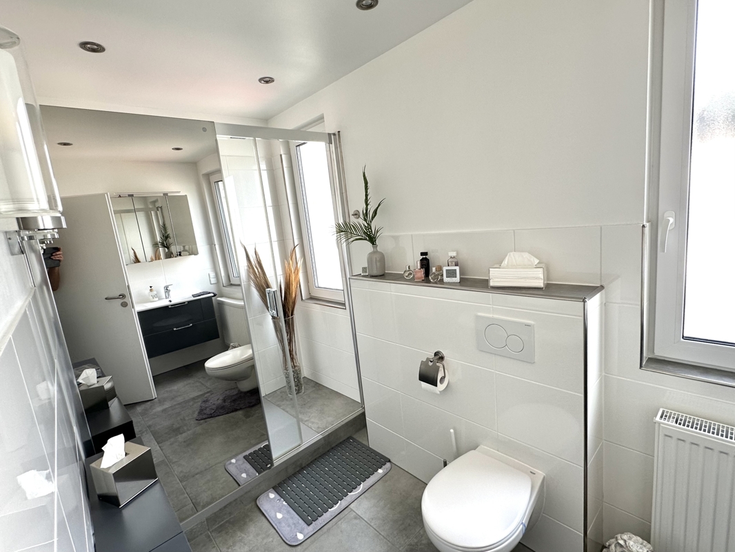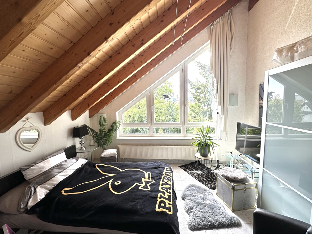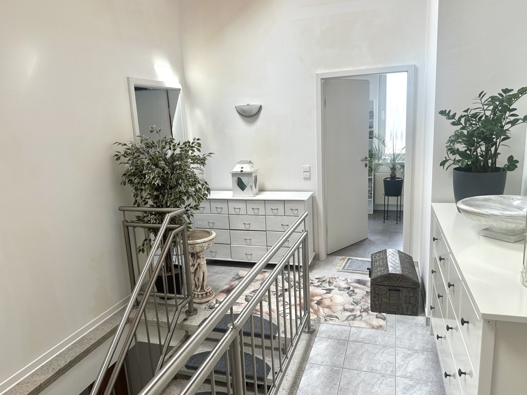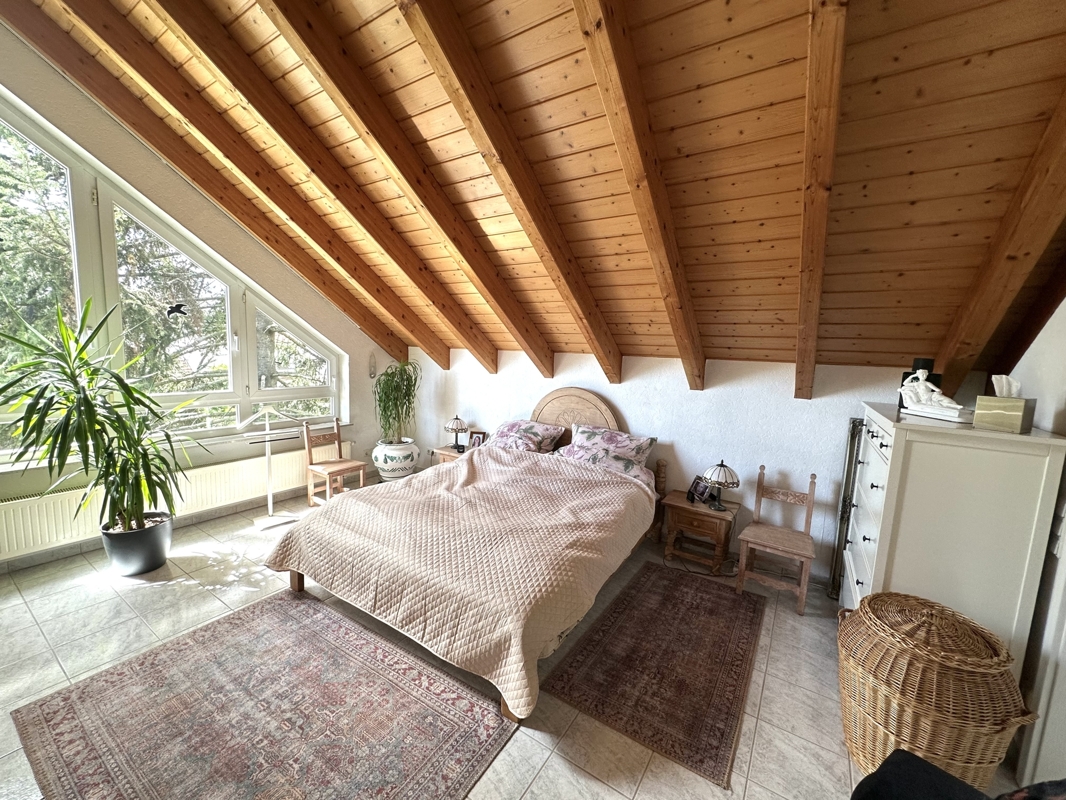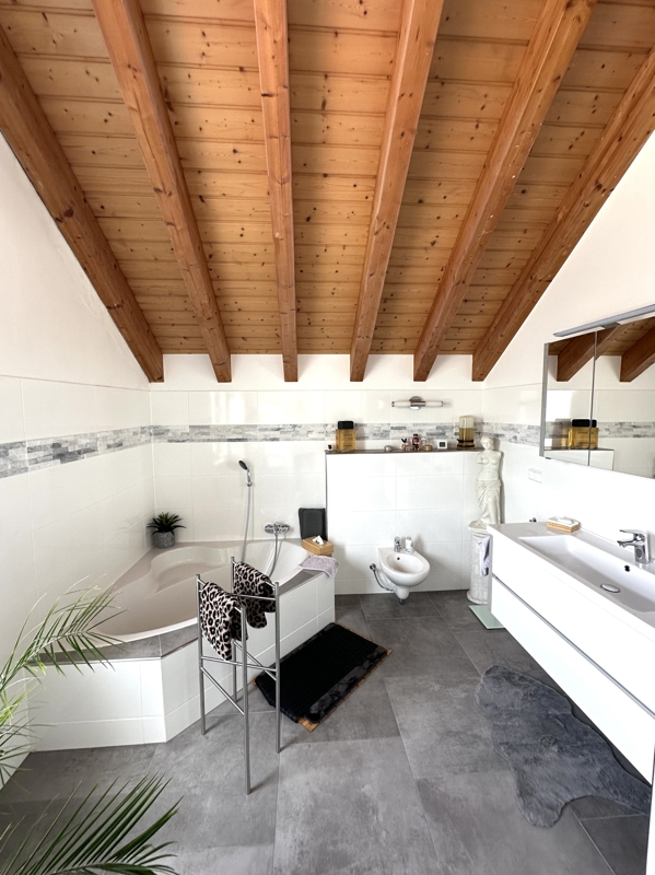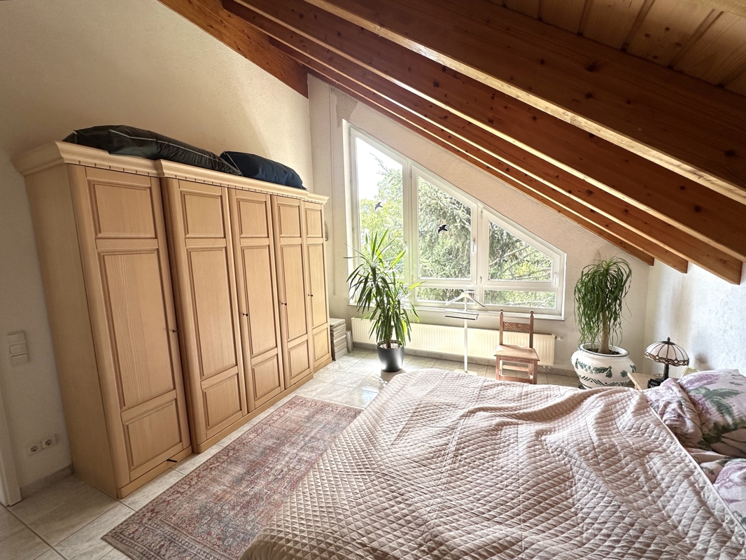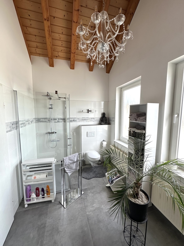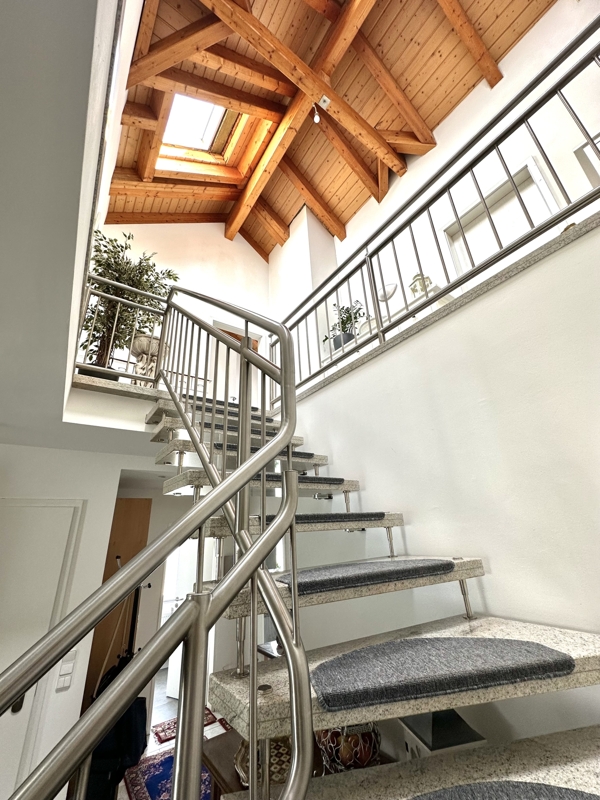 Eine breite stabile Edelstahltreppe führt Sie in den Dachgeschossbereich, wo sich ein großes modernes Bad mit Eckbadewanne und Dusche sowie drei Schlafzimmern und ein Ankleidezimmer befinden. Auch die moderne Etagenheizung ist hier untergebracht. Alle Zimmer sind bis zum Giebel hin geöffnet, wodurch sie noch größer wirken.