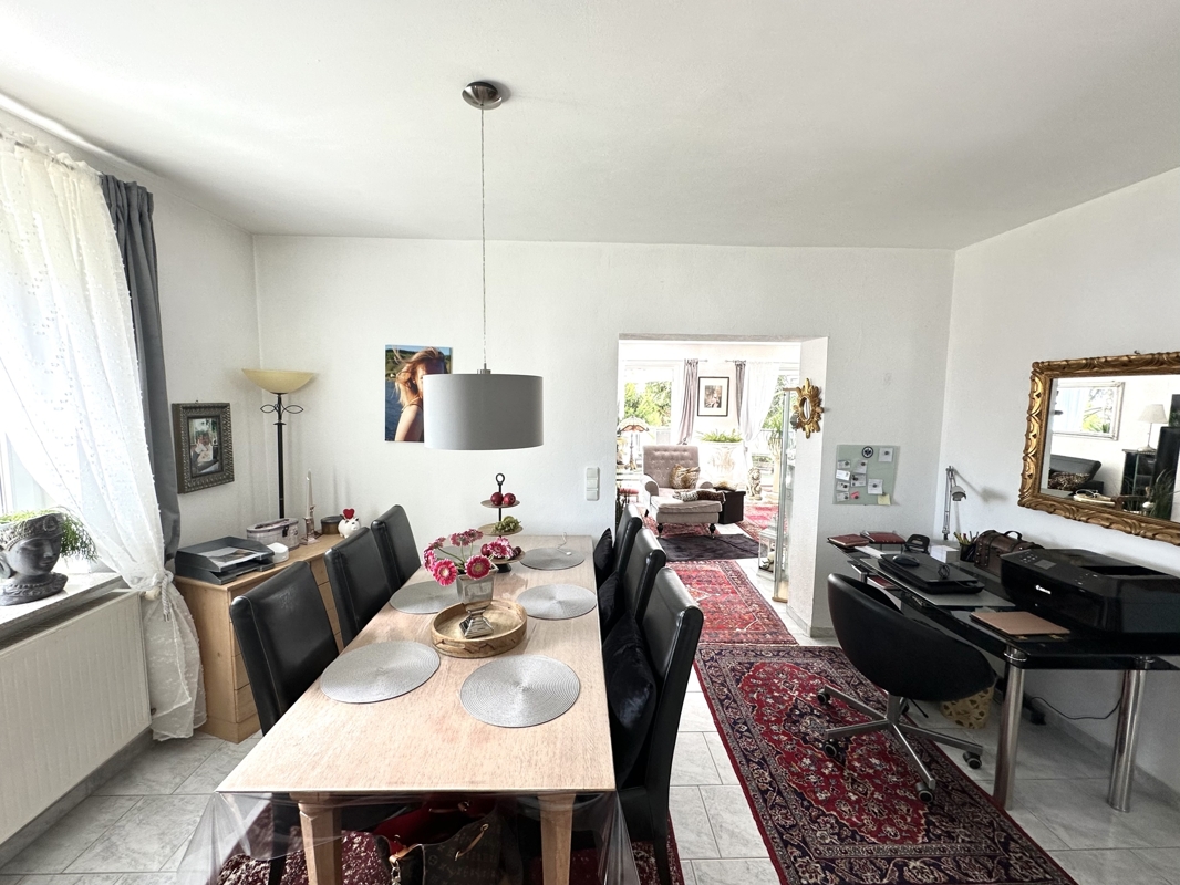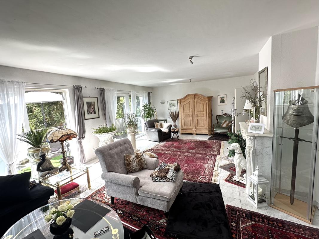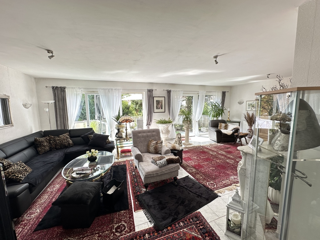 Auf der unteren Ebene befinden sich eine geräumige Diele mit Zugang zu Küche, Gäste-WC, Esszimmer und sehr großem Wohnzimmer mit Ausgang zum Balkon. Von hier aus führt eine Treppe direkt in den Garten.