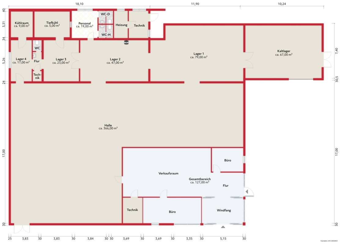 - Personalraum mit Damen- und Herren-WC, plus ein weiteres WC