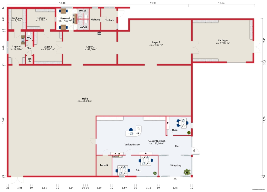 - Abgetrennter Büro- und Ausstellungsraum, von ca. 150 m²
